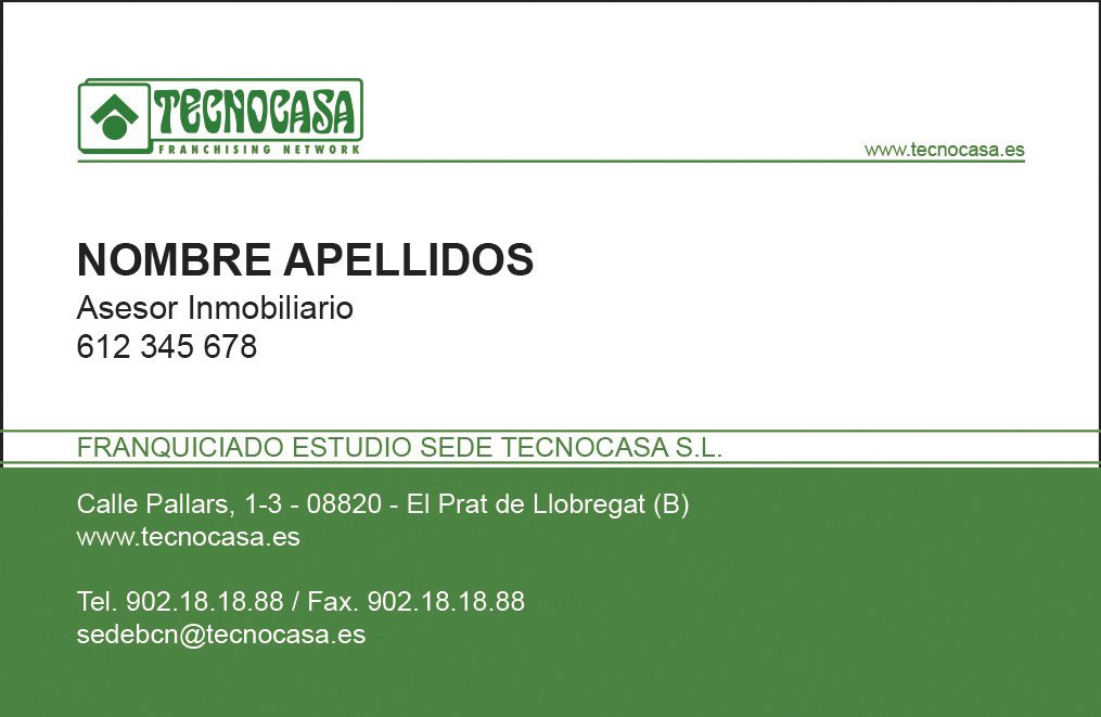 Tarjetas de visita para agentes Tecnocasa en papel 300 grms laminado mate con imagen corporativa Tecnocasa oficial. Personaliza con tu nombre, número de oficina y contacto de agente.