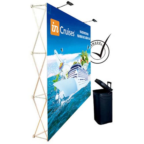 Photocall popup textil 219×219 cm con imagen Incruises oficial. Poliéster sublimación, velcro y maleta. Para ferias y eventos.