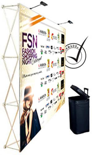 Roll up display de aluminio con gráfica en lona 450 gr y funda acolchada. Montaje en 30 segundos. Para ferias, eventos y puntos de venta.